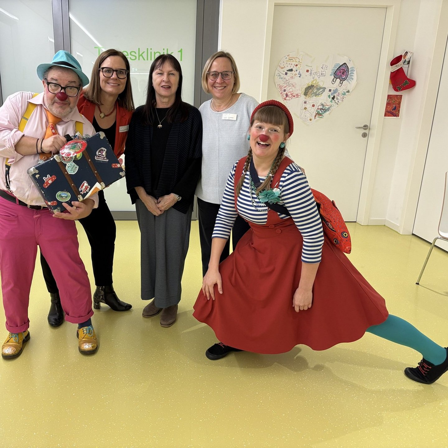 Foto (kbo-Heckscher-Klinikum): von links nach rechts: Dr. Roger Palletti, Priv.-Doz. Dr. Katharina Bühren, Elisabeth Makepeace (Vorstandsvorsitzende KlinikClowns e.V.), Dr. Almut von Foerster, Mizzi Mortadella