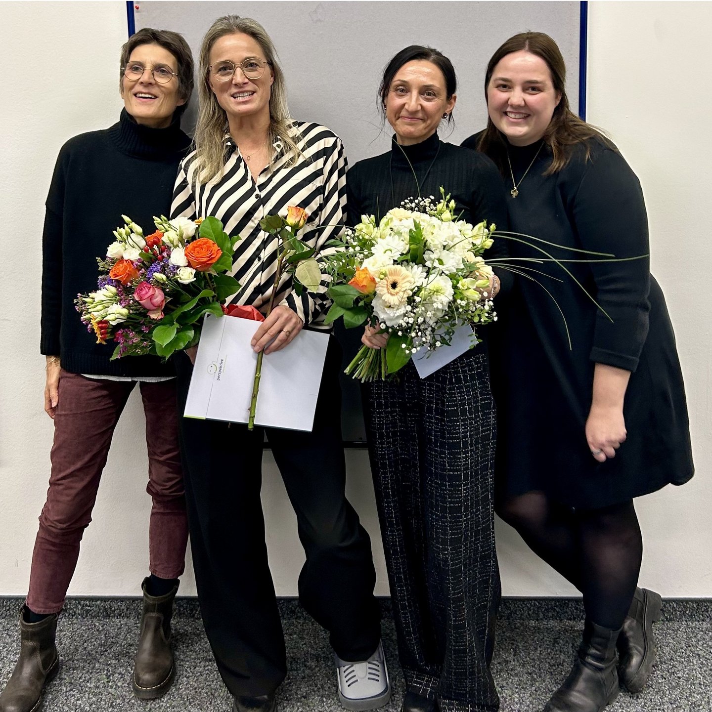 Nadine Breitenbach und Diana Spitzer können stolz auf sich sein: sie haben mit sehr gutem Ergebnis die Weiterbildung zur Stationsleitung (nach DKG) abgeschlossen. Die Teilnehmenden erlangen dort in anderthalb Jahren Kompetenzen in den Bereichen Personalführung, Organisationsentwicklung, Qualitätsmanagement und Recht. Die Pflegedienstleiterin des Standorts Rottmannshöhe, Andrea Mainz und Christina Schachner, die stellvertretende Pflegedienstleiterin in München, beglückwünschten sie zu ihrem Erfolg mit Blumensträußen. „Ich bin jetzt besser gewappnet, Veränderungsprozesse auf Station zu planen und zu begleiten,“ freut sich Nadine Breitenbach, die auf der Rottmannshöhe arbeitet. „Für das gesamte Team des Pflege- und Erziehungsdienst ist es eine große Bereicherung und Unterstützung. Wir sind gespannt auf die neuen Ideen und Kompetenzen der Beiden,“ so Andrea Mainz.