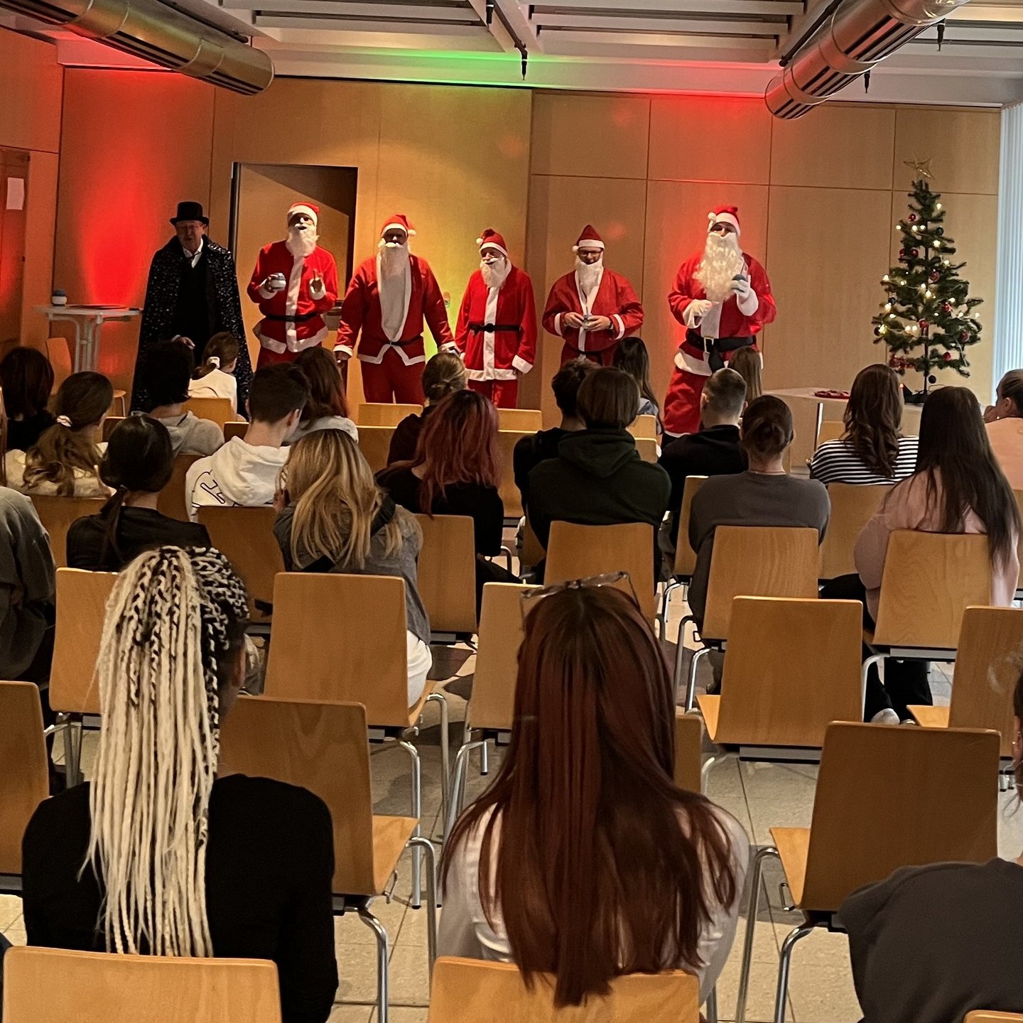 Am 5. Dezember waren wieder die ganz speziellen Weihnachtsmänner zu Gast im kbo-Heckscher-Klinikum in München. Die sieben Männer – darunter ein „Schweinachtsmann“, ein Engel und ein cooler Elch – führten in Form eines Singspiels den Patientinnen und Patienten und einigen Mitarbeitenden eine etwas andere Geschichte rund um Weihnachten auf. Dabei kommentierten sie auch aktuelle gesellschaftspolitische Themen - für das jugendliche Publikum absolut altersentsprechend. Ihr Auftritt in der Aula kam bei den Patientinnen und Patienten bestens an - eine schöne Abwechslung zum Klinikalltag und die perfekte Einstimmung auf das nahende Weihnachtsfest.